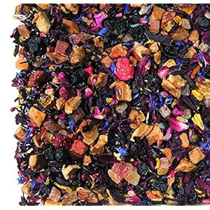Zutaten: Hibiskusblüten, Apfelstücke, Papayawürfel (Papaya, Zucker), Korinthen, Fliederbeeren, schwarze Johannisbeeren, Aroma, gefr.-getr. Himbeerstücke, gefr.-getr. Erdbeerstücke, Sonnenblumenblüten, blaue Kornblumenblüten.