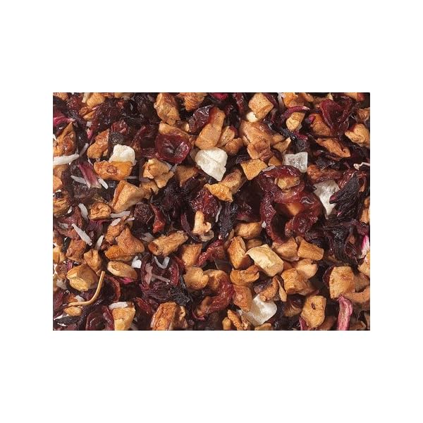 Zutaten: Apfelstücke, Hibiskusblüten, Hagebuttenschalen, Ananaswürfel, Kokosraspeln, Aroma