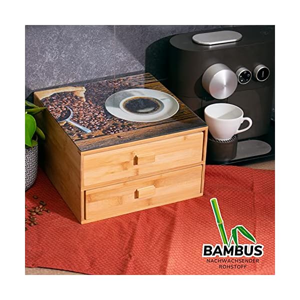 UNIVERSELL – Die Kaffeekapsel-Box eignet sich für gängige Kaffeekapseln verschiedener Systeme, sowie für Teebeutel, Zuckerpäckchen oder auch andere kleine Dinge rund um Ihr liebstes Heißgetränk. Die warme Optik von Bambus mit der Dekor-Glasplatte ist ein echter Blickfang! Bambus ist angenehm in der Handhabung und ist ein schnell nachwachsender Rohstoff mit dem sind Sie bestens aufgestellt sind.