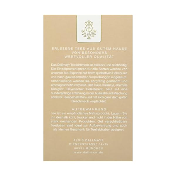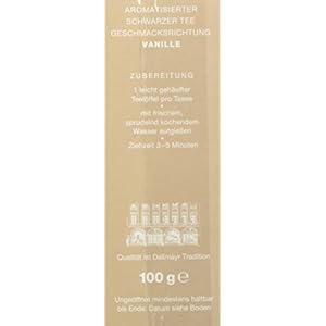 Aromatisierte Tees bringen Abwechslung in die Tasse. Diese erlesene Ceylon Mischung ist mit ganzen Vanillestücken und den Aromastoffen der Vanille verfeinert. Zubereitung: 1 leicht gehäufter Teelöffel pro Tasse mit frischem, sprudelnd kochendem Wasser aufgießen Ziehzeit 3-5 Minuten Aufbewahrung: Tee ist ein empfindliches Naturprodukt. Lagern Sie ihn deshalb kühl, trocken und nicht in der Nähe von stark riechenden Produkten. Gut verschließbare Teedosen sind ideal zur Aufbewahrung oder als kleines Geschenk für Teeliebhaber geeignet. Erlesene Tees aus gutem Hause – von besonders wertvoller Qualität Das Dallmayr Teesortiment ist exklusiv und reichhaltig: Die Einzelprovenienzen für alle Sorten werden von unserem Tee-Experten auf ihrem qualitativen Höhepunkt und nach gewissenhaften Verprobungen eingekauft. Anschließend werden sie sorgfältig gemischt und aromageschützt verpackt. Das Haus Dallmayr, ehemals Königlich Bayerischer Hoflieferant, baut auf eine hundertjährige Erfahrung in der Auswahl und Mischung edelster Teespezialitäten und hat sich ganz dem guten Geschmack verpflichtet. Mehr Information: http://www.dallmayr.de/tee