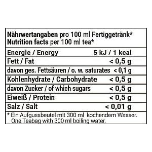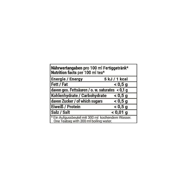 Zutaten: Hibiskusblüten, Weinbeeren, Holunderbeeren, Kirschen (15%), Aroma, Sauerkirschstücke (1%) Zubereitung: 4-5 geh. TL / Liter, bei 100 Grad ca. 8-10 Minuten ziehen lassen