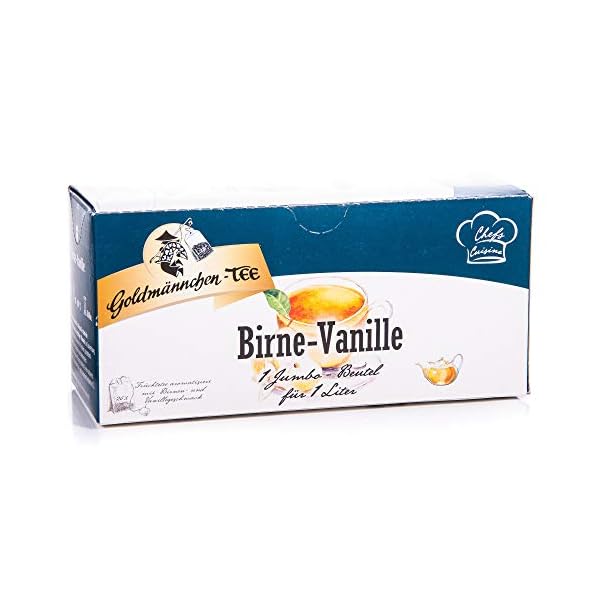 Feiner aromatisierter Früchtetee mit Williams-Christ-Vanille-Note. Deutlicher Geschmack und Geruch nach süßer Birne, eingebunden in Vanille. Milde Säure gibt dem Tee eine zarte Fruchtigkeit. Tassenfarbe goldorange. Empfehlung Kalt, mit Fruchtsaft gemischt, ein besonderer Genuß. Zubereitung: 1 JUMBO-Beutel für 1 Liter, in Kanne mit siedendem Wasser hängen (Filterbeutel nicht direkt mit Wasser übergießen und nicht weiterkochen). Filterbeutel mehrmals schwenken. Ziehzeit: 10-12 Minuten.