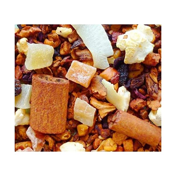 Zutaten Apfelstücke (Apfel, Säuerungsmittel: Zitronensäure), kandierte Ananasstücke (Ananas, Zucker), kandierte Papayastücke (Papaya, Zucker), Rote Beetestücke, Zimtstangen, Aroma, Weinbeeren, Kokoschips (Kokosnuss, Zucker), gebrannte Mandeln (Mandeln, karamellisierter Zucker)(2%), Popcorn (Mais, Zucker, Rapsöl)