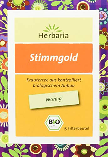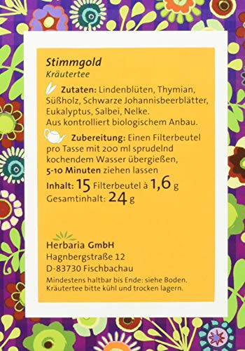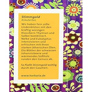 Produktbeschreibung Wellbeing Tee – Wer seinen Stimmorganen etwas Gutes tun will trinkt „Stimmgold“. Fein süße Lindenblüten kombiniert mit den kräftig würzigen Klassikern Thymian und Salbei. Nelke und Eukalyptus intensivieren und erfrischen mit ihren starken ätherischen Ölen. Die Blätter der schwarzen Johannisbeere und wärmendes Süßholz runden den Genuss ab. So fließt Stimmgold wohlig durch den Gaumen. Damit kann man sich etwas Gutes tun. Ob „Voller Schwung“ in den Morgen oder „Ruhig & Gut“ durch die Nacht, mit „Stimmgold“ den Hals pflegen oder ausgeglichen durch die Zeit des weiblichen Wandels – die acht neuen Kräutertee-Kompositionen von Herbaria bringen Wohlgefühl und Lebensfreude ins Teeregal. Den richtigen Tee zur rechten Zeit – acht Mischungen speziell abgestimmt auf ganz unterschiedliche Bedürfnisse und Lebenslagen. Alle Zutaten sind natürlich aus kontrolliert biologischem Anbau und werden mit größter Sorgfalt auf Beikräuter, Schadstoffe usw. labortechnisch geprüft. So wird es garantiert ein sicherer Genuß. Inhaltsstoffe / Zutaten Zutaten:Lindenblüten, Thymian, Süßholz, Schwarze Johannisbeerblätter, Eukalyptus, Salbei, Nelke. Aus kontrolliert biologischem Anbau. Gebrauchsanweisung Einen Filterbeutel pro Tasse mit 200 ml sprudelnd kochendem Wasser übergießen, 5-10 Minuten ziehen lassen.