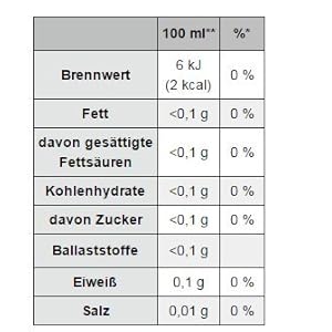Brennwert in kJ 3 Brennwert in kcal 1 Fett in g 0,1 davon gesättigte Fettsäuren in g 0,1 Kohlenhydrate in g 0,1 davon Zucker in g 0,1 Eiweiß in g 0,2 Salz in g 0,01
