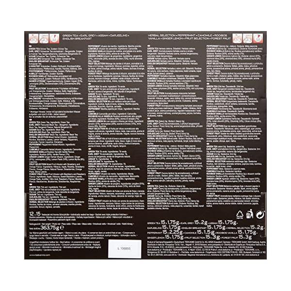 Zutaten: GREEN TEA: Grüner Tee; EARL GREY: Schwarzer Tee, Bergamottearoma, Bergamotte-Öl; ASSAM: Schwarzer Tee; DARJEELING: Schwarzer Tee; ENGLISH BREAKFAST: Schwarzer Tee; 8 KRÄUTER: Rotbusch, Brombeerblätter, Zitronenverbene, Pfefferminze, Kamille, Fenchel, Süßholz, Zimt; PFEFFERMINZE: Pfefferminze; KAMILLE: Kamille; ROOIBOS VANILLA: Rotbusch (93%), Vanillearoma (7%); INGWER ZITRONE: Ingwer (51%), Lemongras (25%), Zitronenschalen (10%), Zitronenmyrte (8%), S&u…