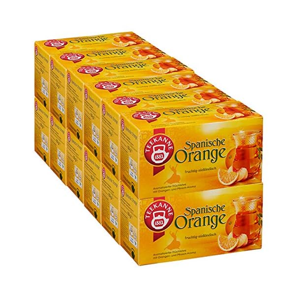 Teekanne Spanische Orange Ländertee fruchtig südländich 50g 12er Pack Früchtetee spanische Orange: Erleben Sie mit TEEKANNE Spanischer Orange die südländische Lebensfreude und genießen Sie den fruchtig-südländischen Geschmack. Über das Produkt: Entdecken Sie Spanien – mit TEEKANNE Spanische Orange. Erleben Sie mit TEEKANNE Spanische Orange die südländische Lebensfreude und lassen Sie sich vom berühmten spanischen Temperament mitreißen. Genießen Sie den süßen Geschmack nach Orangen, abgerundet mit lecker-fruchtigem Pfirsicharoma. Genauso aufregend wie das Land ist, schmeckt dieser Tee – fruchtig und südländisch zugleich. Auch kalt getrunken ist TEEKANNE Spanische Orange die ideale Erfrischung für den ganzen Tag, nicht nur in der Siesta. Gehen Sie auf eine Reise der Sinne mit TEEKANNE Spanische Orange! Zubereitung: Aufguss: 100°C Ziehzeit: 5-8 Minuten Unser Zubereitungs-Hinweis:Nehmen Sie für eine Tasse 1 Teebeutel und mindestens 3 Teebeutel für eine Kanne. Immer mit sprudelnd kochendem Wasser aufgießen und mindestens 5-8 Minuten ziehen lassen! Nur so erhalten Sie ein sicheres Lebensmittel! TEEKANNE GmbH & Co. KG Kevelaerer Str. 21-23 40549 Düsseldorf Deutschland Hibiscus sabdariffa: Unter rund 200 Malvenarten findet sich eine, die nach dem Welken der Blüte einen verdickten Blütenkelch ausbildet, der gesammelt und getrocknet wird. Nur dieser Hibiscus sabdariffa ergibt im Aufguss eine der schönsten Farben in der Natur und nur dieser ist ein Nationalgetränk der Ägypter und Sudanesen. Glycyrrhica glabra: Süßholz ist eine bis zu zwei Meter hoch wachsende Pflanze, welche von Frühling bis Herbst blüht. Die Wurzeln der Pflanze werden für die Weiterverarbeitung genutzt, indem Sie getrocknet und gerieben werden. Zutaten: Äpfel, Hibiskus, süße Brombeerblätter, weißer Hibiskus, Orangenaroma (8%), Orangensaftkonzentrat (5%), Süßholz, Pfirsicharoma, Pfirsichgranulat Inhalt: 20 Doppelkammerbeutel à 2.5 g 100ml Tee* enthalten d