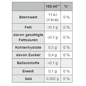 Brennwert in kcal 2 Brennwert in kJ 8 Fett in g 0,1 davon gesättigte Fettsäuren in g 0,1 Kohlenhydrate in g 0,3 davon Zucker in g 0,2 Eiweiß in g 0,2 Salz in g 0,01