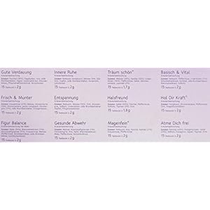 Zutaten:Gute Verdauung:Fenchel, Hagebutten, Anis, süße Brombeerblätter, Ingwer, Holunderblüten,Löwenzahnkraut, Pflaumensaftkonzentrat, ArtischockenBasisch & Vital:Rotbusch, Pfefferminze, Lindenblüten, Schachtelhalmkraut, Karotten,süße Brombeerblätter, Brennnesselkraut, SüßholzGesunde Abwehr:Melisse, Acerolasaftgranulat, Zitronenmyrte, Anis, Äpfel, Brennnesselkraut,Mate, Pfefferminze, SonnenhutkrautInnere Ruhe:Rotbusch, Honeybush, Melisse, Zimt, Süßholz, Hopfen, süße Brombeerblätter,Kardamom, LotusblütenFrisch & Munter:Krauseminze, Melisse, Zitronenmyrte, Zitronenverbene, Grüner Honigbusch,Zitronengras, Süße Brombeerblätter, OrangenblütenEntspannung:Rotbusch, Melisse, Zimt, Zitronengras, Süßholz, Lindenblüten,süße Brombeerblätter, Hopfen, PfingstrosenblütenTräum schön:Melisse, Kamille, Lindenblüten, Pfefferminze, Salbei, Zitronenverbene,LavendelAtme Dich frei:Fenchel, Orangenschalen, Salbei, Süßholz, Eukalyptus, Ingwer,Thymian, ZimtMagenfein:Rotbusch, Anis, Fenchel, Kamille, Krauseminze, PfefferminzeHol Dir Kraft:Honigbusch, Zitronenverbene, Pfefferminze, Zimt, RingelblumenblütenHalsfreund:Salbei, Fenchel, Pfefferminze, Süßholz, Thymian, ZimtFigur Balance:Mate, Brennnesselkraut, Acerolasaftgranulat, Krauseminze, Melisse,Pfefferminze, Brombeerblätter, Süße Brombeerblätter, Kornblumenblüten
